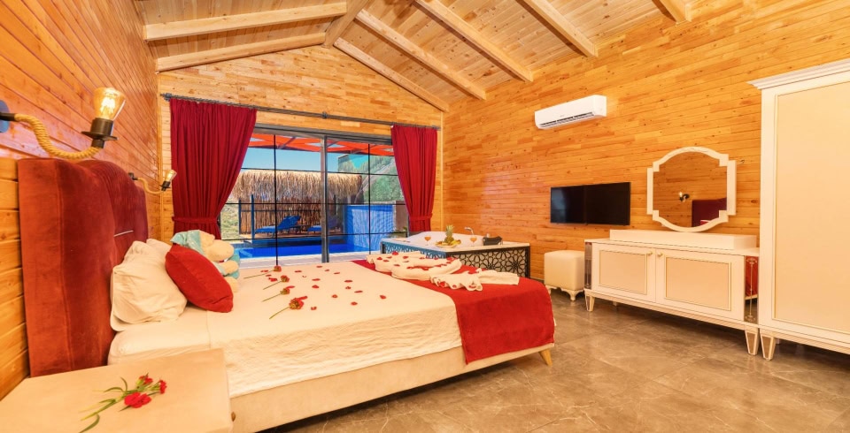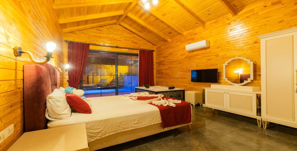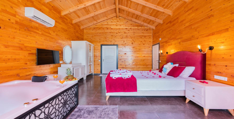 Yatak Odası : 1 adet çift kişilik yatak, klima, elbise dolabı, makyaj masası, komodin, jakuzi, banyo ve lavabo bulunmaktadır.