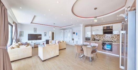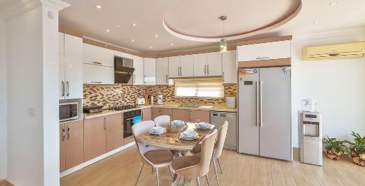 Mutfak : Modern Amerikan mutfak içerisinde 6 kişilik yemek masası, mama sandalyesi, buzdolabı, bulaşık makinası, fırın, ocak, mikrodalga fırın, tost makinası, yemek masası, yemek takımları, çatal ve bıçak takımları, tencere ve tava takımları, bardaklar bulunmaktadır.