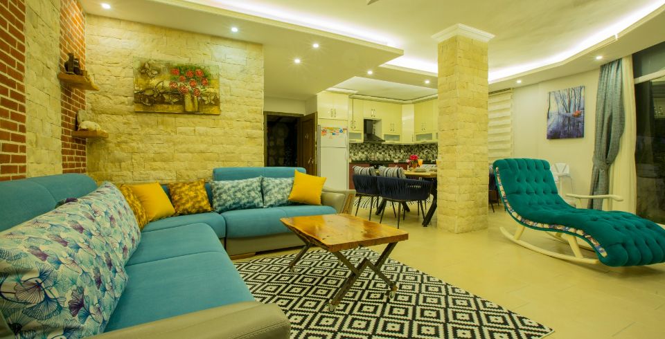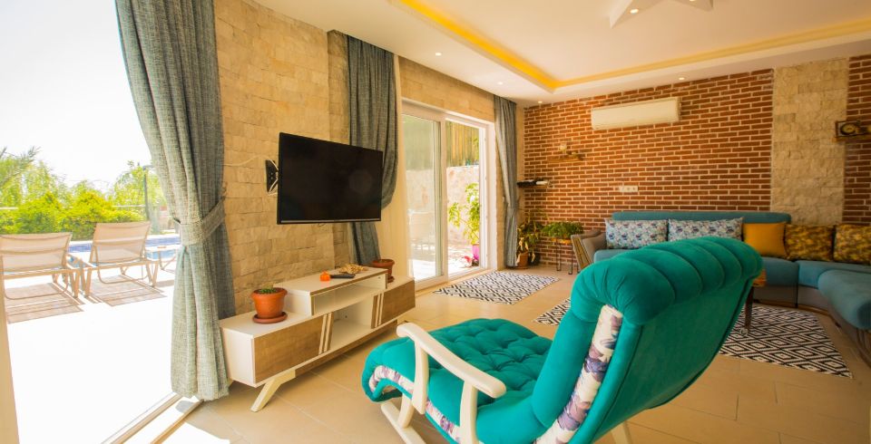 Salon : Villa Dere’nin salonunda sizi şık bir oturma grubu ile klima, TV, internet, uydu, koltuk, sehpa ile ferah bir salon bekliyor olacaktır. Havuz terasına çıkış yapılmaktadır.
