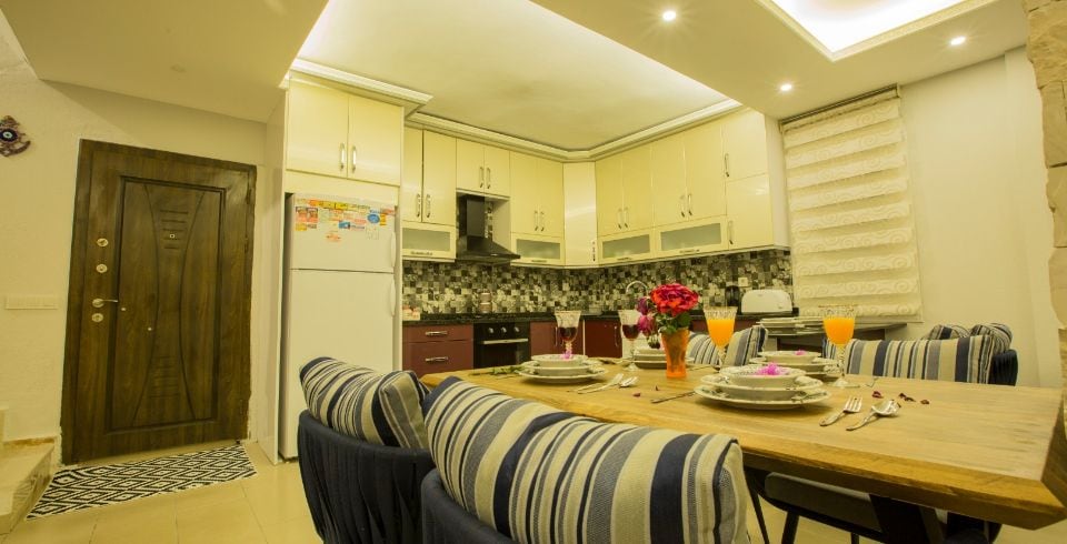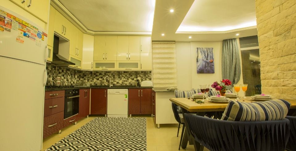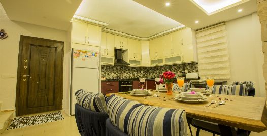 Mutfak : Villamızın geniş Amerikan mutfağı ile sizlere kendi evinizin mutfağı gibi hissettirecek. Ayrıca mutfakta klima, bulaşık makinası, buzdolabı, çamaşır makinası, mikrodalga fırın, tost makinası, ekmek kızartma, su ısıtıcısı, fırın, 4`lü ocak seti ve 6 kişilik geniş yemek masası ile tava tencere vb. mutfak araç gereçlerini kullanma fırsatını sizlere sunuyoruz.