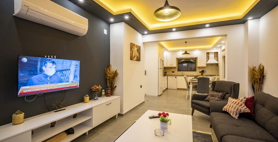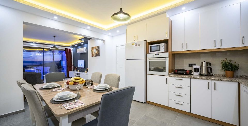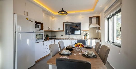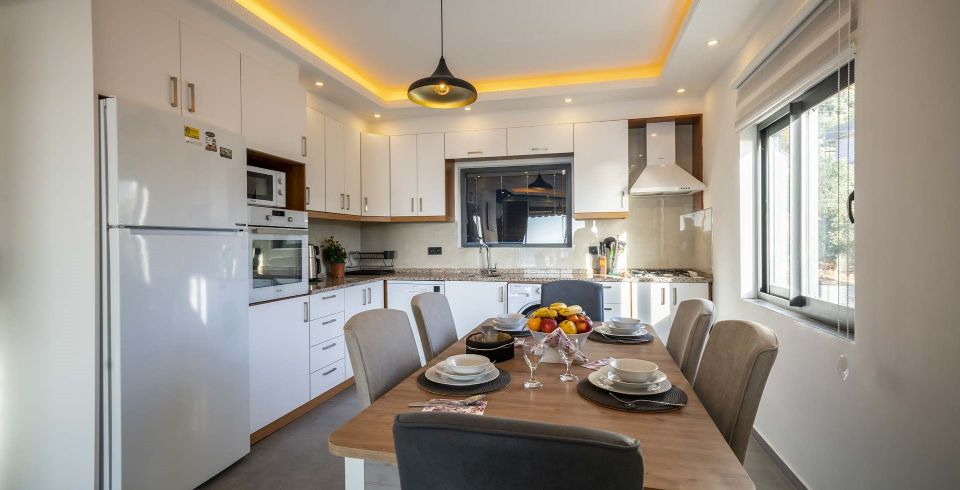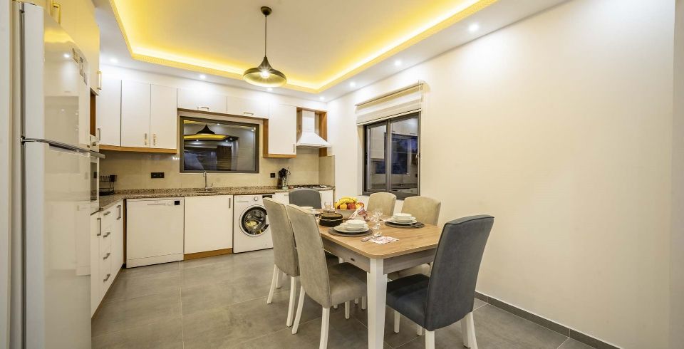 Mutfak : Amerikan mutfakta buz dolabı, bulaşık makinesi, fırın, mikrodalga fırın, 4’lü ocak (ankastre), elektrikli su ısıtıcı, 8 kişilik yemek takımları, çatal ve bıçak takımları, tencere ve tava takımları, bardaklar bulunmaktadır.