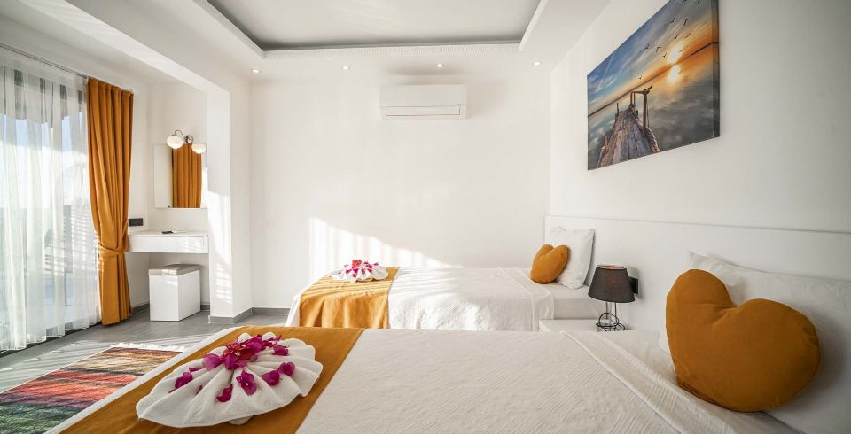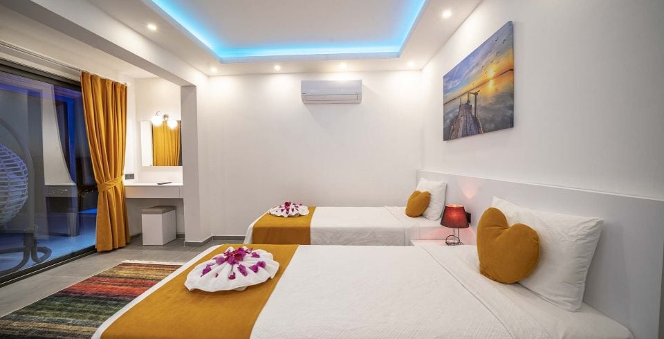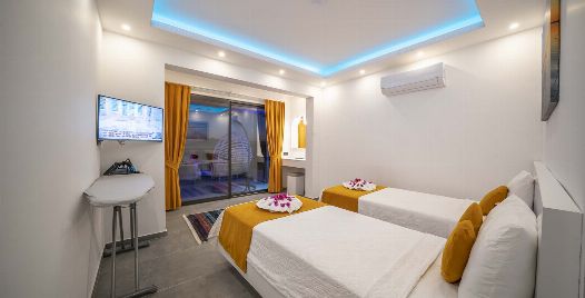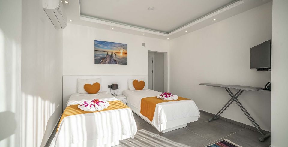 2. Yatak Odası : 2 adet tek kişilik yatak, elbise dolabı, komodin, tv makyaj masası, klima, banyo ve tuvalet bulunmaktadır.