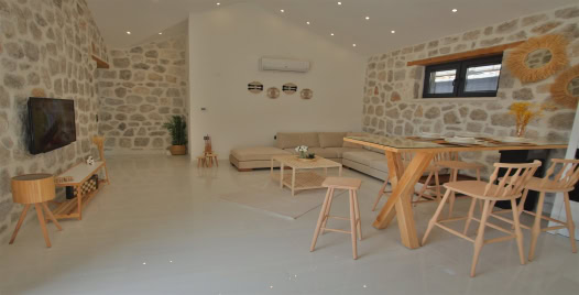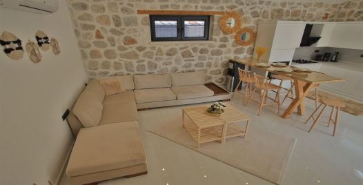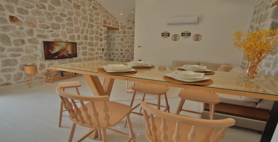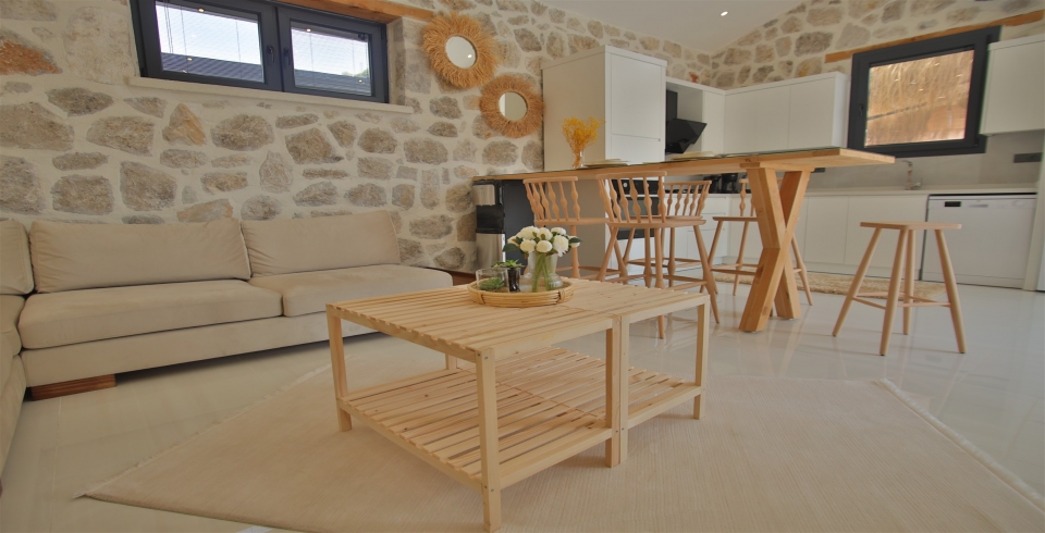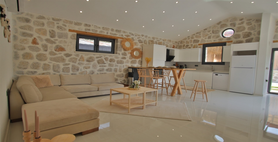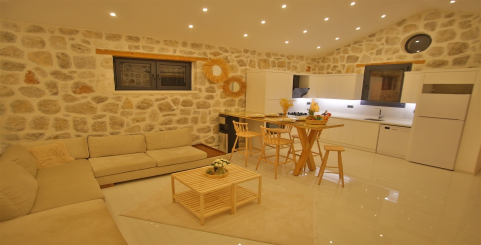 Salon: Villa salonunda konforlu oturma grubu, klima, TV, internet, uydu alıcı, yemek masası, sehpa bulunmaktadır.