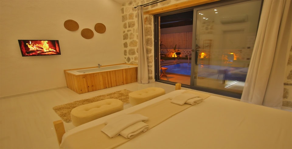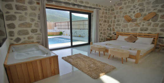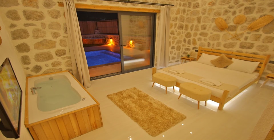 1. Yatak Odası: Çift kişilik yatak, klima, jakuzi, komodin, elbise dolabı, makyaj masası, banyo ve tuvalet bulunmaktadır.
