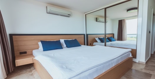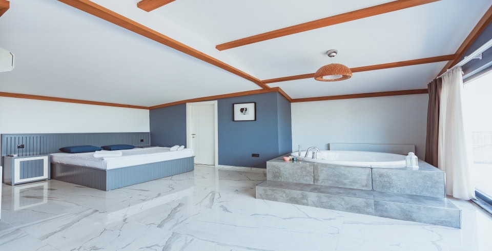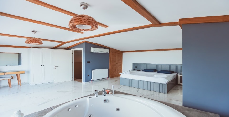 1. Yatak Odası: 1 adet çift kişilik yatak, elbise dolabı, makyaj masası, klima ve banyo-tuvalet yer almaktadır.