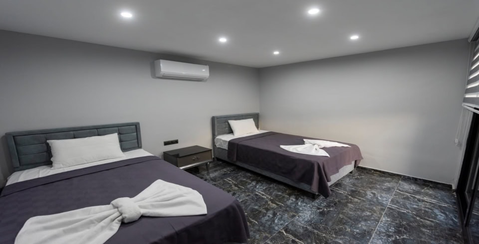 1.Yatak Odası: 2 adet tek kişilik yatak, elbise dolabı, komodin, klima, ortak kullanım banyo ve lavabo bulunmaktadır.