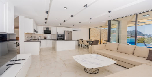 Salon: Villa salonunda konforlu oturma grubu, klima, TV, internet, uydu alıcı, yemek masası, sehpa bulunmaktadır.