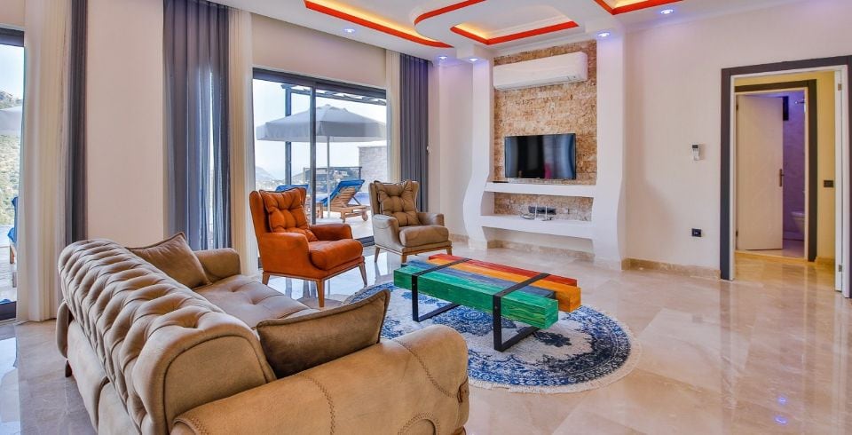Salon : Havuz terasına direkt çıkışı olan çeşitli dekorasyonlarla süslediğimiz salonumuzda kendi evinizmiş gibi hissedeceksiniz. Basık otel odalarından sıkıldıysanız doğa manzaralı korunaklı villamızı tercih edeceğiniz için pişman olmayacaksınız. Geniş salonumuzda oturma grubu, klima, LCD televizyon, sehpa, uydu alıcı bulunmaktadır.