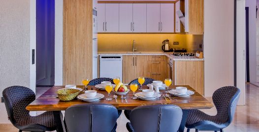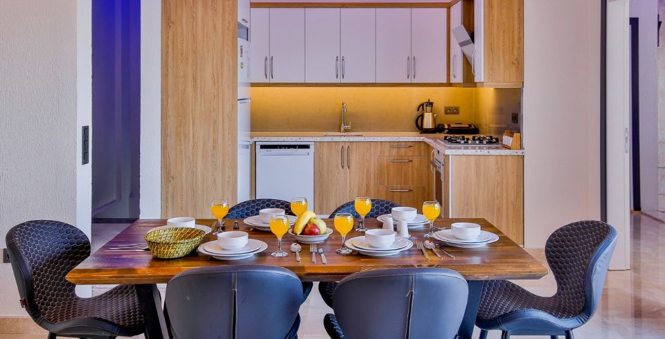 Mutfak : Denize nazır şekilde yemek yapmak Villa Dilek sayesinde daha da keyifli hale geliyor. Modern Amerikan mutfağımızda buzdolabı, bulaşık makinesi, fırın, 4’lü ocak, mikrodalga fırın, elektrikli su ısıtıcısı, tost makinesi, 8 kişilik yemek masası, tencere-tava takımları ve tüm mutfak araç-gereçleri bulunmaktadır.
