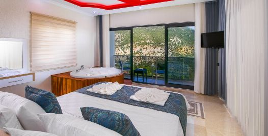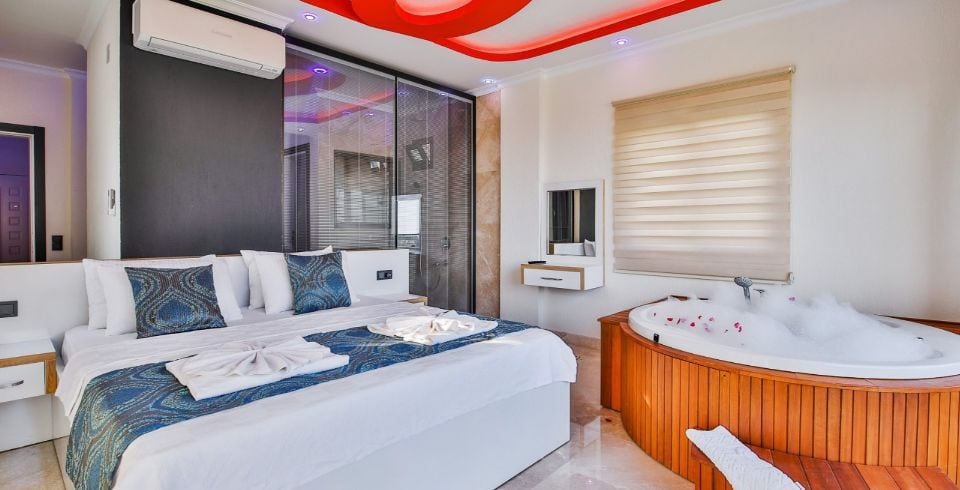 1. Yatak Odası : Birinci yatak odamızda 1 adet çift kişilik yatak, klima, elbise dolabı, makyaj masası, komodin, elbise dolabı, banyo ve lavabo bulunmaktadır. Doğa ile iç içe olup aynı zamanda da muhafazakar villamızda manzaranın keyfini çıkarabileceğiniz balkon ve günün yorgunluğunu atabileceğiniz jakuzi bulunmaktadır.