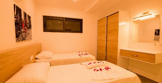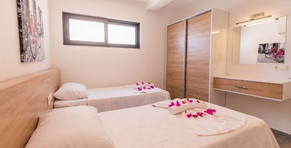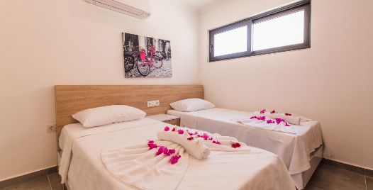 2. Yatak Odası : 2 adet tek kişilik yatak, klima, elbise dolabı, makyaj masası, komodin, banyo ve lavabo bulunmaktadır.