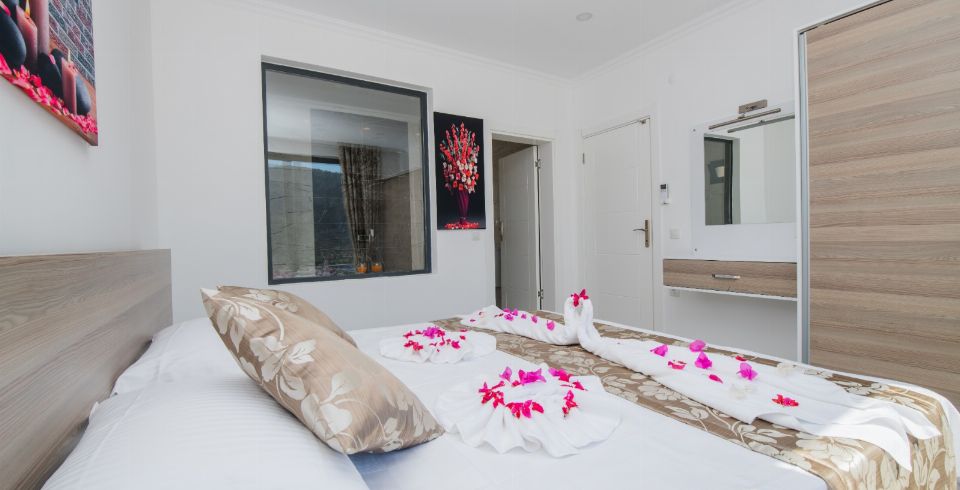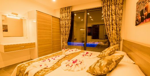 1. Yatak Odası : 1 adet çift kişilik yatak, klima, jakuzi, komodin, elbise dolabı, makyaj masası, banyo ve lavabo bulunmaktadır.
