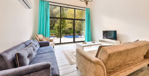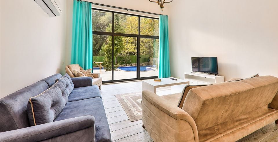 Salon : Villa Doğa 2’nin salonunda sizi şık bir oturma grubu ile klima, televizyon, internet, uydu, koltuk, sehpa ile ferah bir salon bekliyor olacaktır. Havuz terasına çıkış yapılmaktadır.