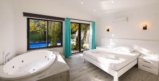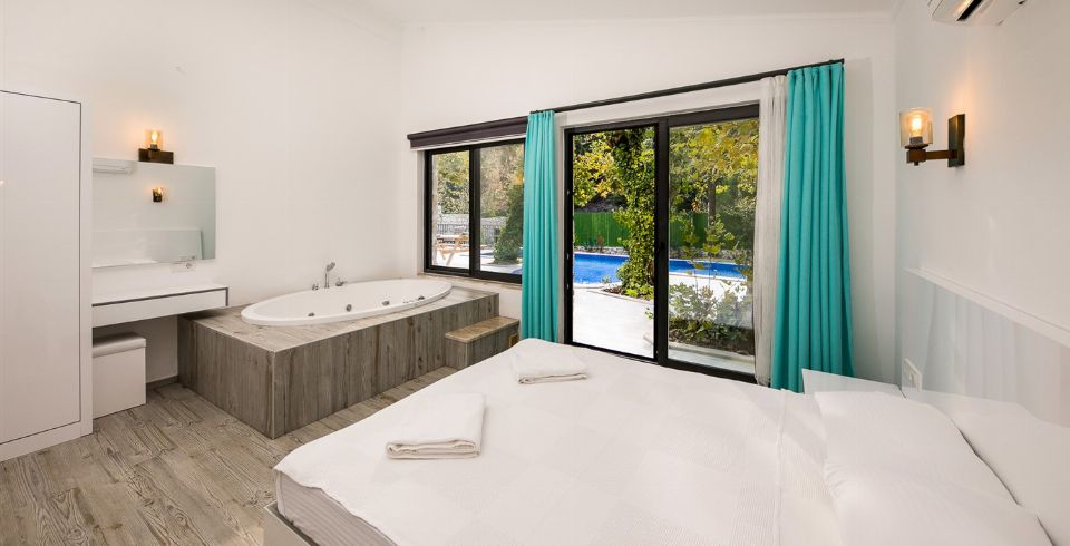 1. Yatak Odası : 1 adet çift kişilik yatak, klima, jakuzi, komodin, elbise dolabı, makyaj masası, banyo ve lavabo bulunmaktadır.