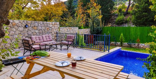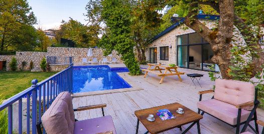 Bahçe : Villamızın bahçesinde özel yüzme havuzu, güneşlenmeniz için 4 adet şezlong, güneşlenme terası, 4 kişilik masa, oturma grubu, mangal keyfiniz için barbekü, güneş şemsiyesi bulunmaktadır.