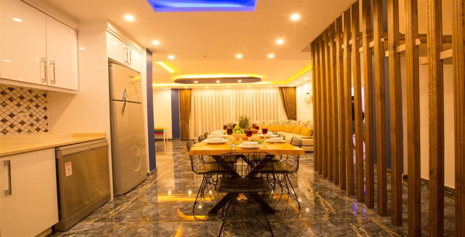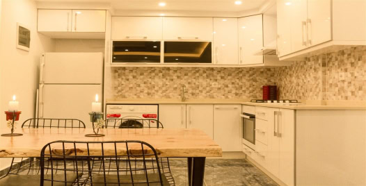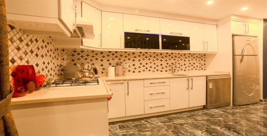 Mutfak : Beyaz dolapları ile modernliği yakalayan Amerikan mutfak içerisinde buzdolabı, bulaşık makinesi, çamaşır makinesi, ocak, fırın, mikrodalga fırın, su ısıtıcısı, yemek masası, yemek takımı ve yemek pişirme araç gereçleri yer almaktadır.
