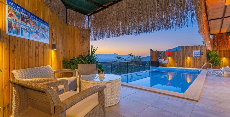 Korunaklı özel yüzme havuzu, havuz terası ve şezlonglarla donatılmış güneşlenme alanı, mahremiyet odaklı konaklama isteyenler için büyük avantaj sağlar. Tam donanımlı mutfak; ankastre ocak, fırın, buzdolabı, mikrodalga ve gerekli mutfak gereçleri ile yemek hazırlama imkânı sunar. Oturma alanı, TV ve klima gibi konfor öğeleriyle donatılmıştır.