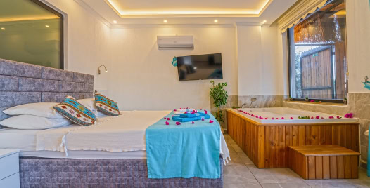 1.Yatak Odası: 1 adet çift kişilik yatak, elbise dolabı, komodin, klima, makyaj masası, TV, jakuzi, banyo ve lavabo bulunmaktadır.