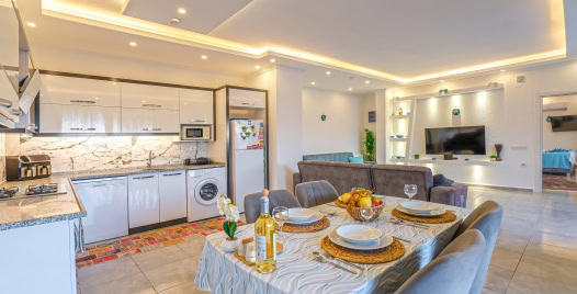Mutfak: Açık planlı mutfak, 2 kişiye yetecek kadar mutfak malzemeleri, buzdolabı, fırın, ocak, mikrodalga fırın, bulaşık makinesi, çamaşır makinesi, tost makinesi, kettle ve çaydanlık bulunmaktadır..