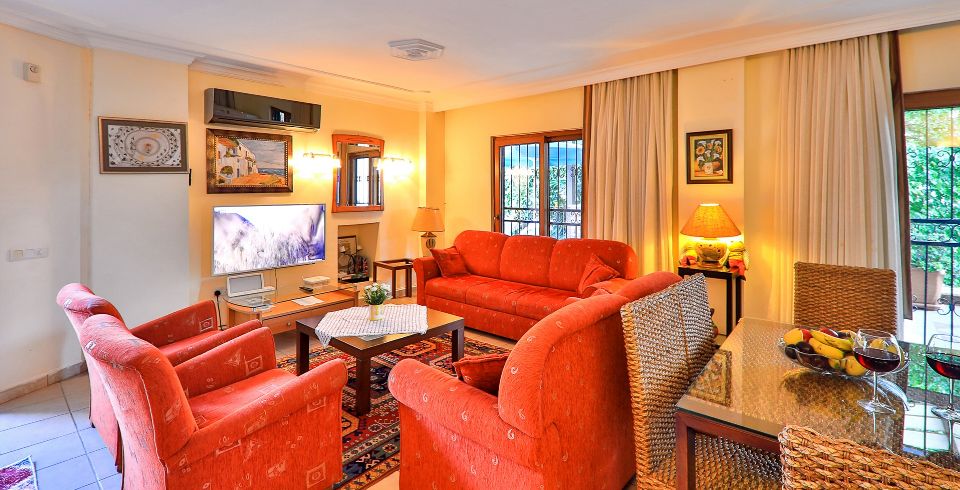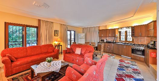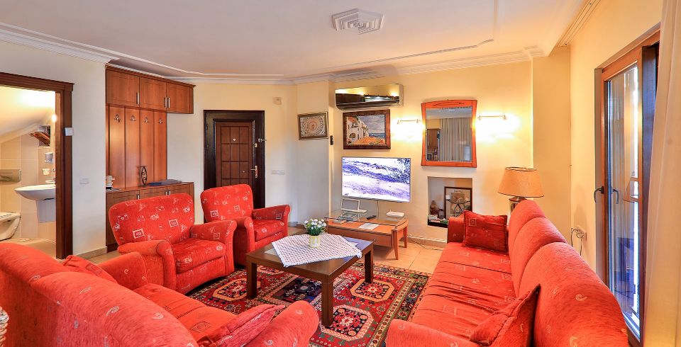Salon: Salon içerisinde oturma grubu, TV, klima, sehpa, bulunmaktadır. Havuz terasına çıkış yapılabilmektedir.