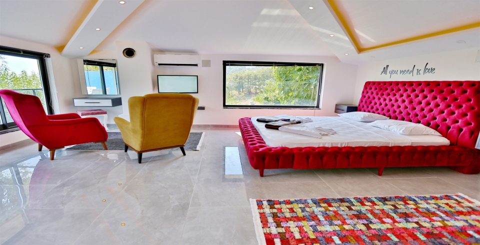 1. Yatak Odası: 1 adet çift kişilik yatak, klima, elbise dolabı, makyaj masası, komodin, jakuzi, banyo ve lavabo bulunmaktadır.
