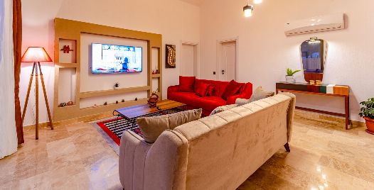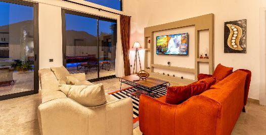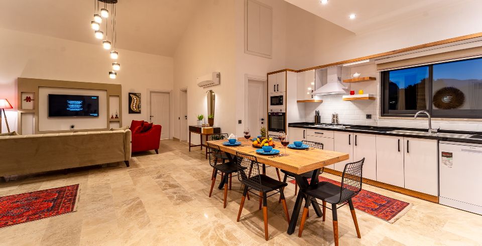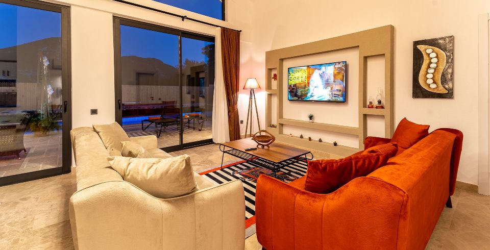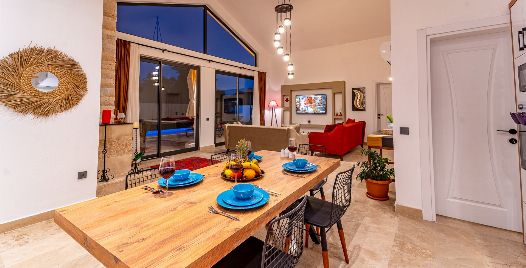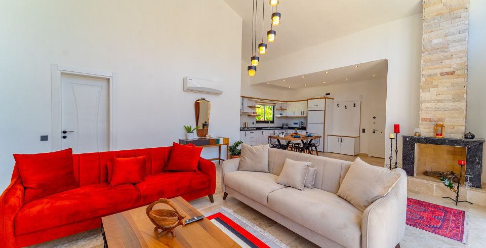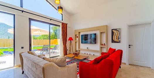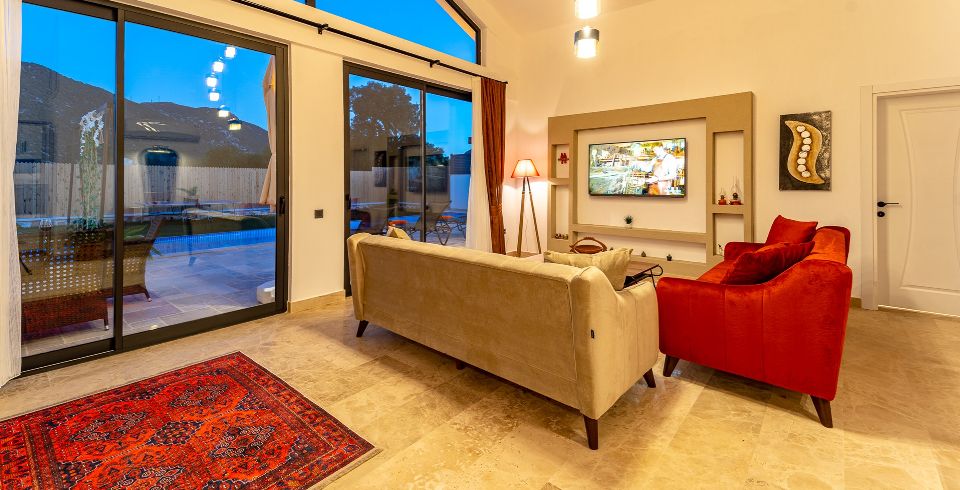 Salon: Villa salonunda konforlu oturma grubu, klima, TV, internet, uydu alıcı, yemek masası, sehpa bulunmaktadır.
