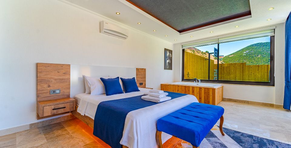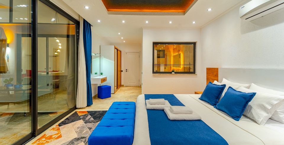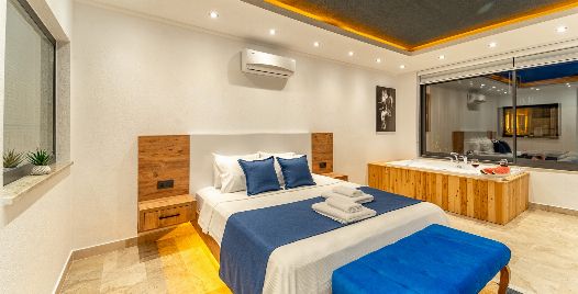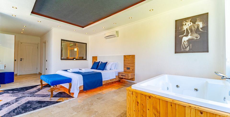 1. Yatak Odası: Çift kişilik yatak, klima, jakuzi, komodin, elbise dolabı, makyaj masası, banyo ve tuvalet bulunmaktadır.
