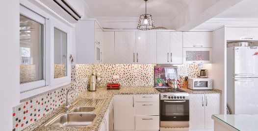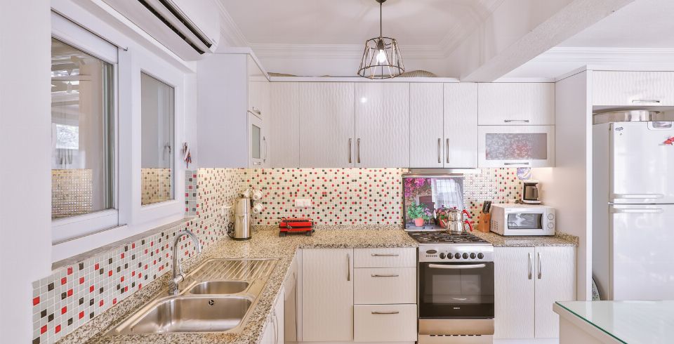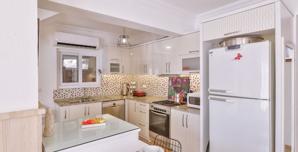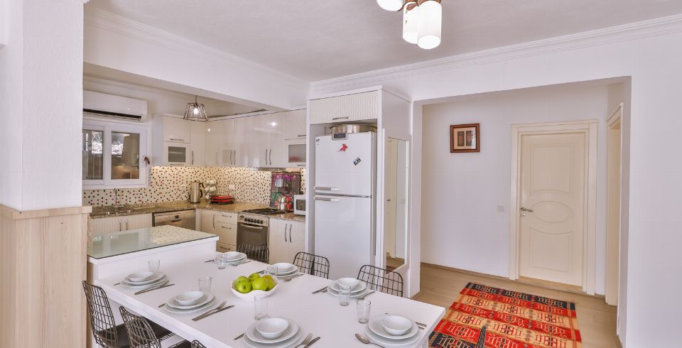 Mutfak : Villamızın içinde modern Amerikan mutfak bulunmaktadır. Mutfakta mikrodalga fırın, bulaşık makinası, ankastre fırın, buzdolabı, çamaşır makinası, ankastre 4’lü ocak, elektrikli su ısıtıcı kettle, ekmek kızartma makinası, tencere ve tava takımı, yemek takımı, kaşık ve çatal seti ve bardaklar bulunmaktadır. Havuz başına geçiş bulunmaktadır.