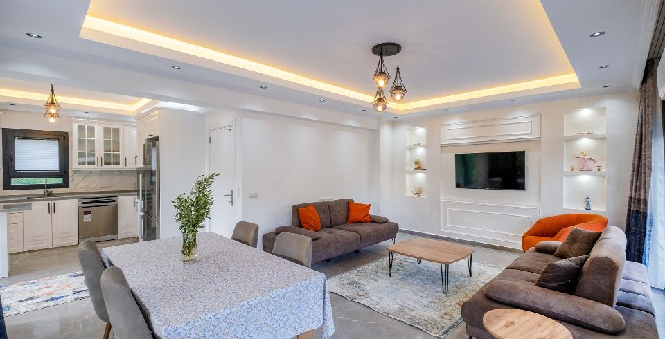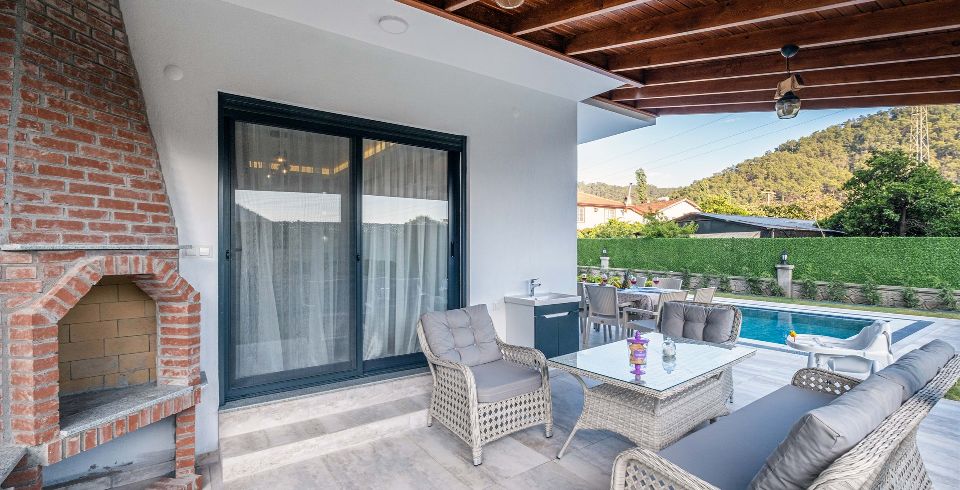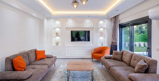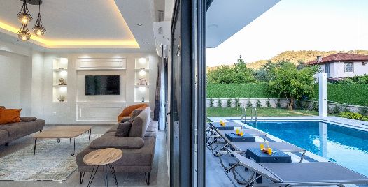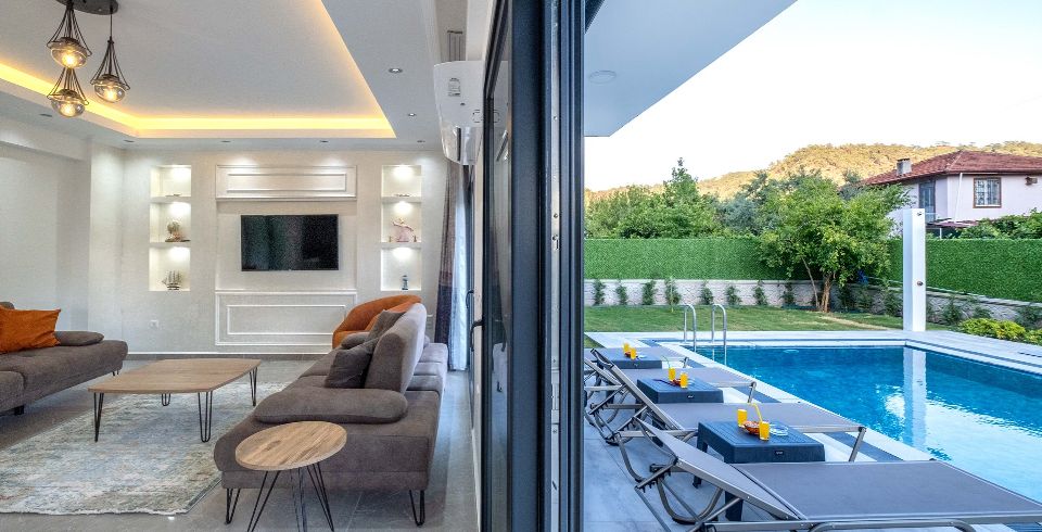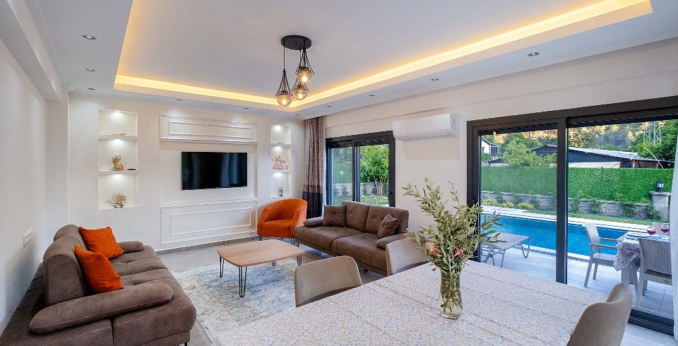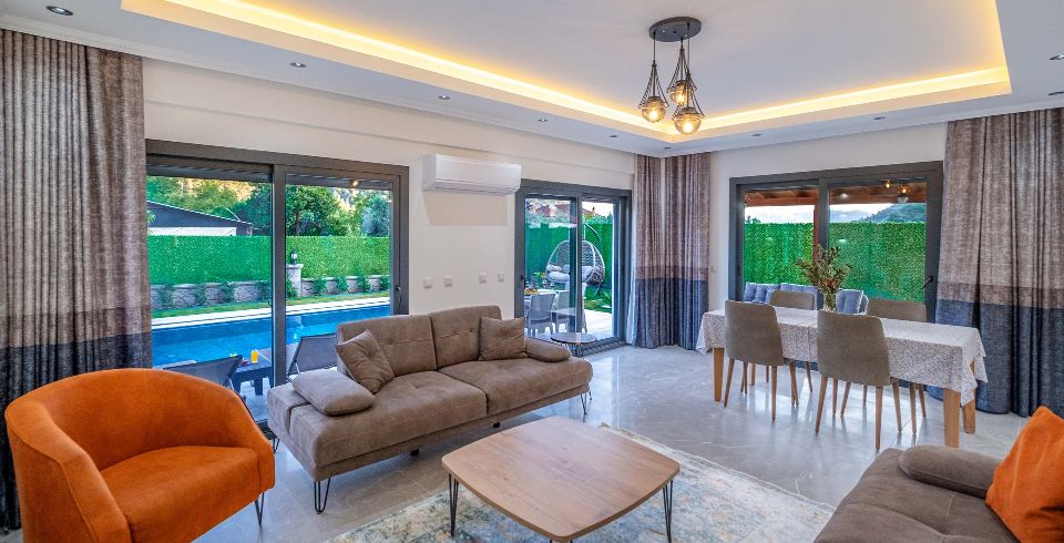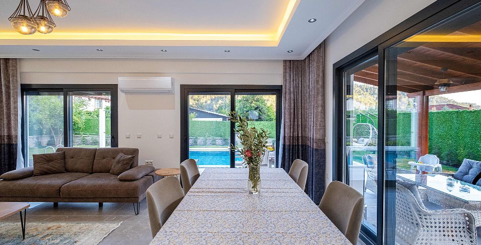 Salon: Villa salonunda konforlu oturma grubu, klima, TV, internet, uydu alıcı, yemek masası, sehpa bulunmaktadır.