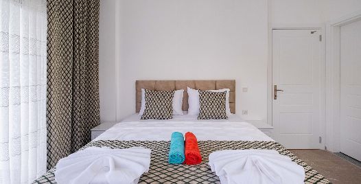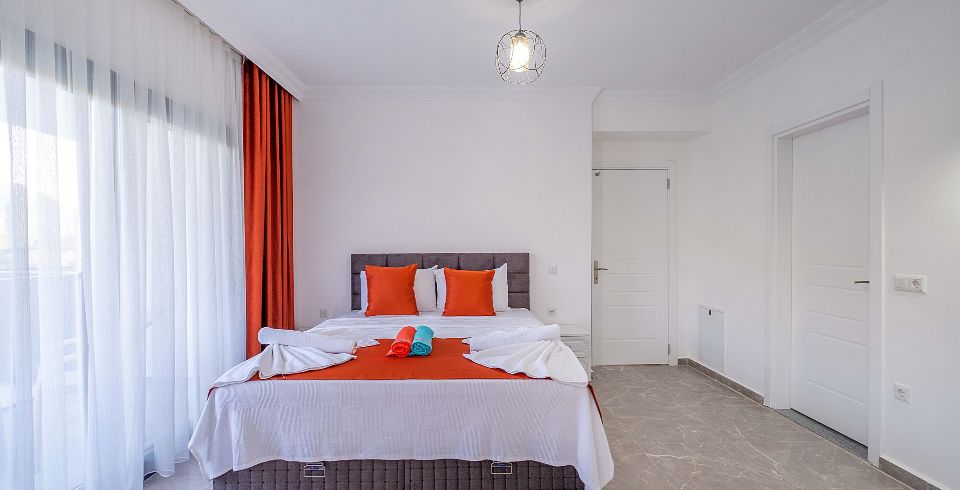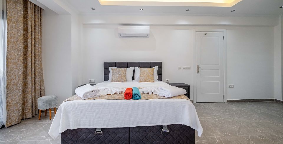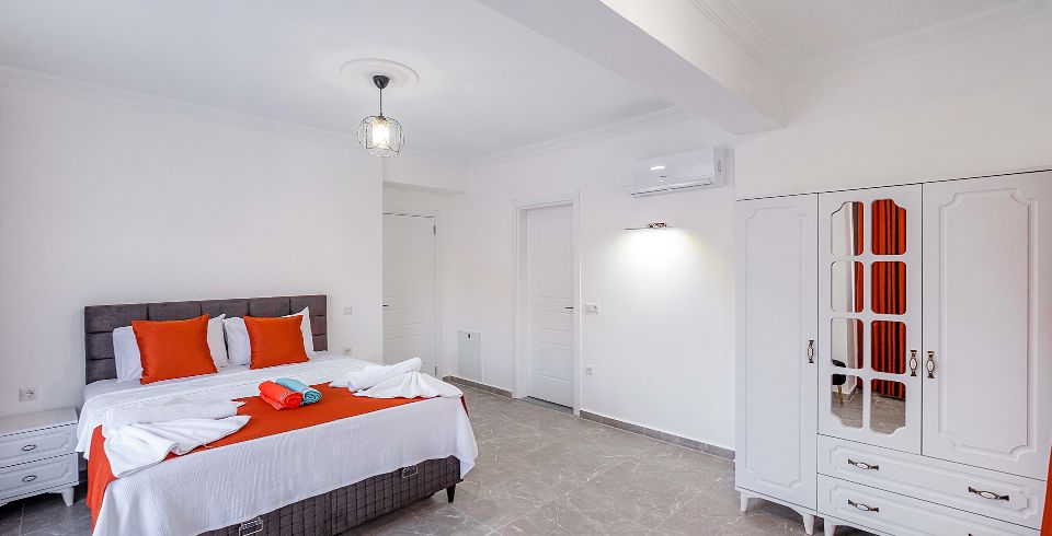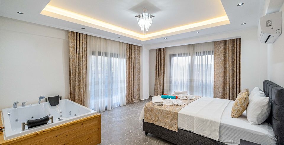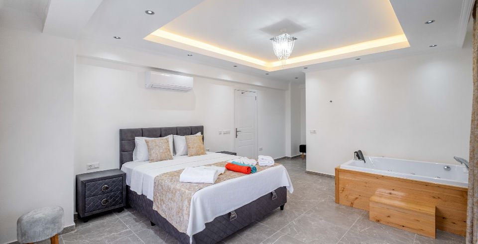 1. Yatak Odası: Çift kişilik yatak, klima, jakuzi, komodin, elbise dolabı, makyaj masası, banyo ve tuvalet bulunmaktadır.
