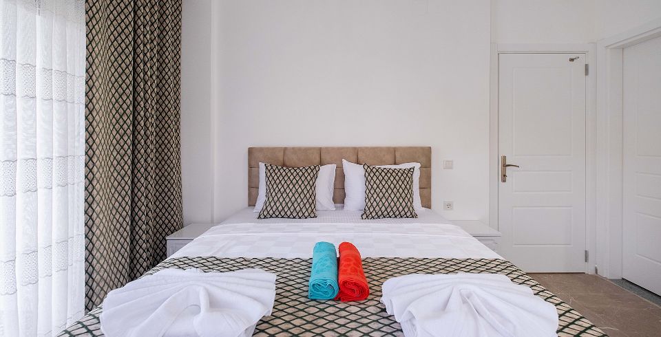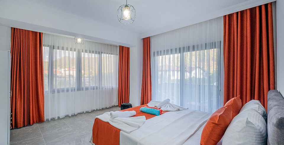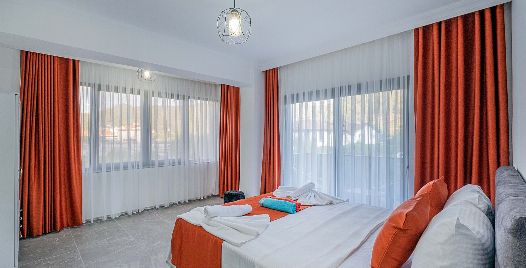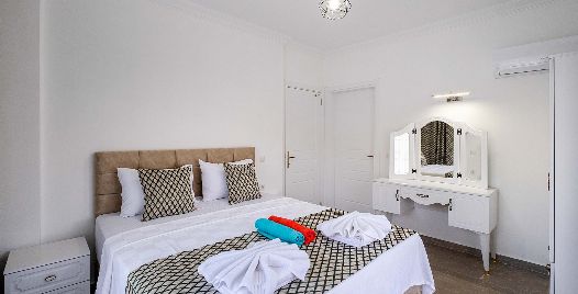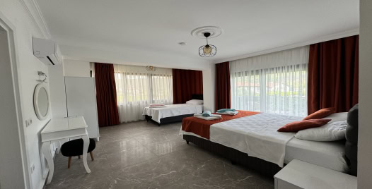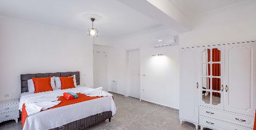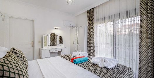 3. Yatak Odası: Çift kişilik yatak, klima, komodin, elbise dolabı, makyaj masası, banyo ve tuvalet bulunmaktadır.