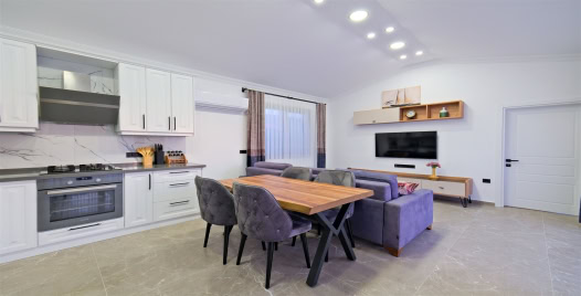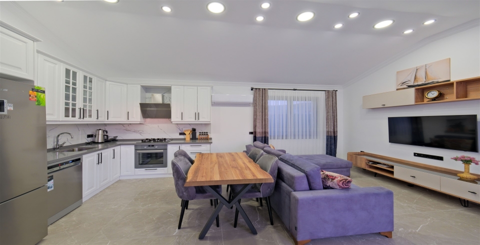 Mutfak : Yemek masası, buzdolabı, çamaşır makinesi, fırın, 4’lü ocak, tost makinesi, elektrikli su ısıtıcısı, çatal-bıçak takımı, tencere-tava takımı, bulaşık makinesi bulunmaktadır.