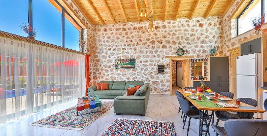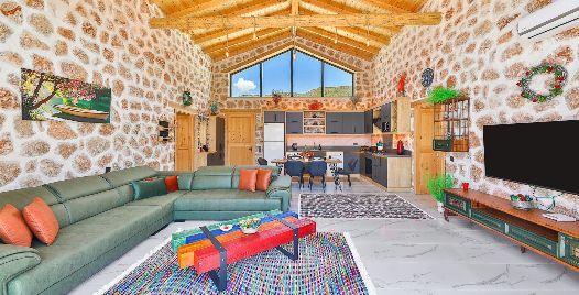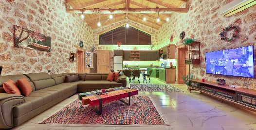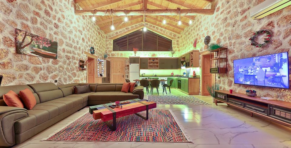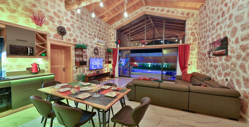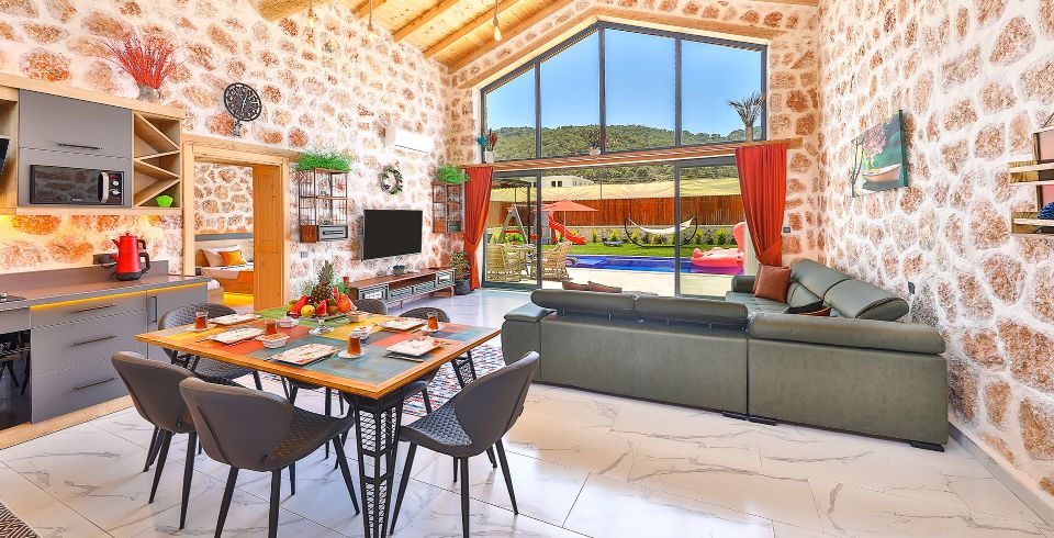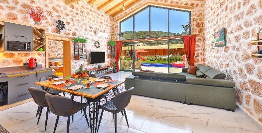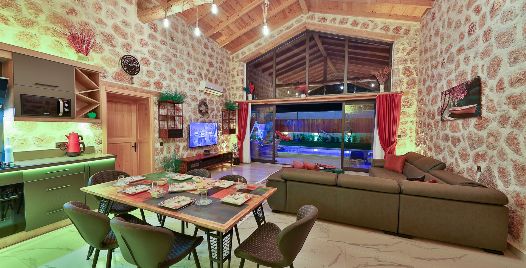 Salon: Villa salonunda konforlu oturma grubu, klima, TV, internet, uydu alıcı, yemek masası, sehpa bulunmaktadır.