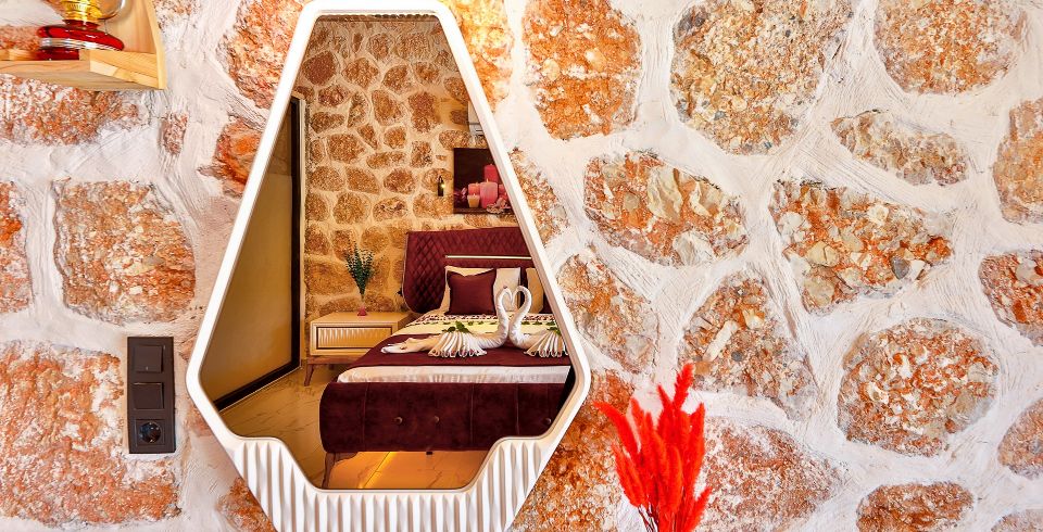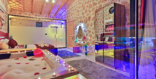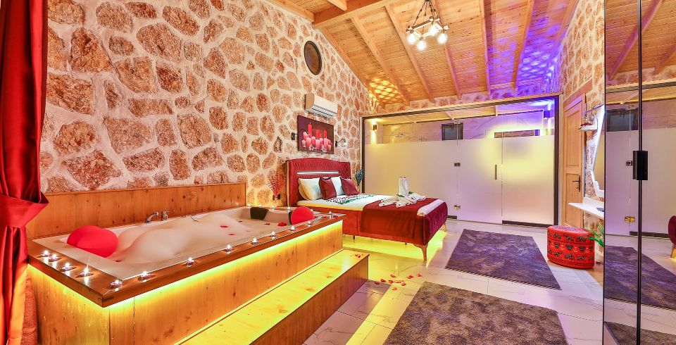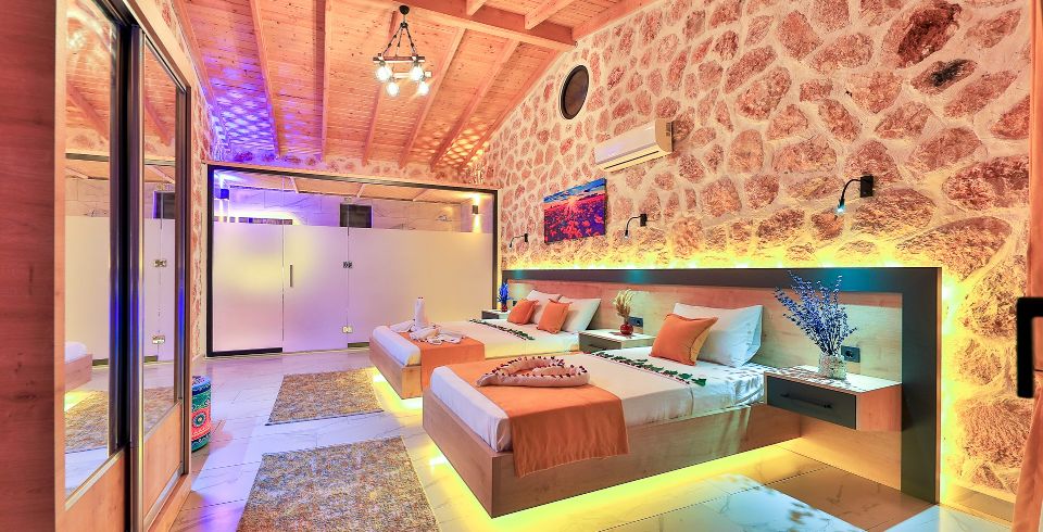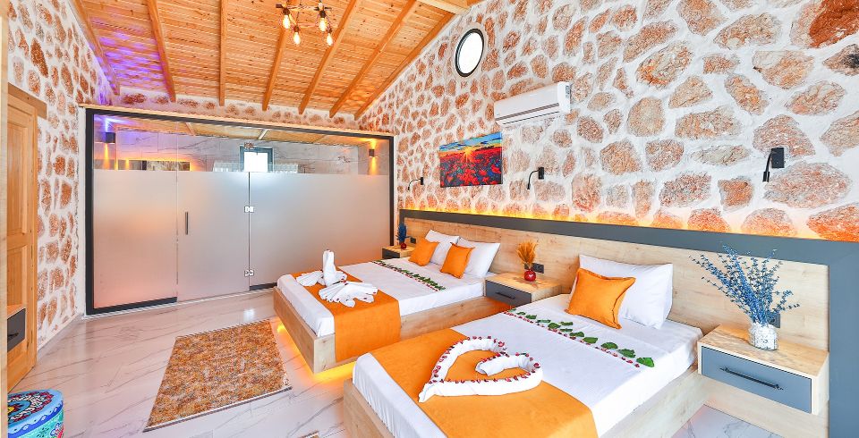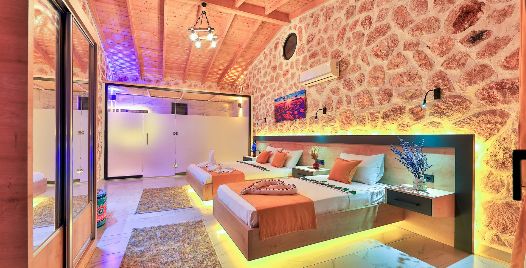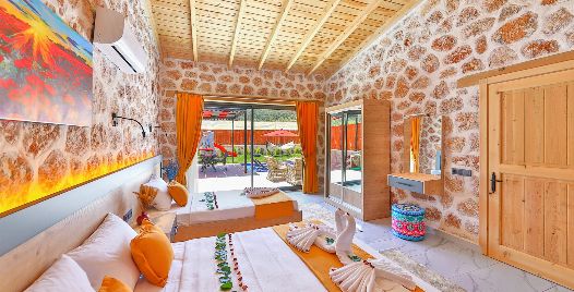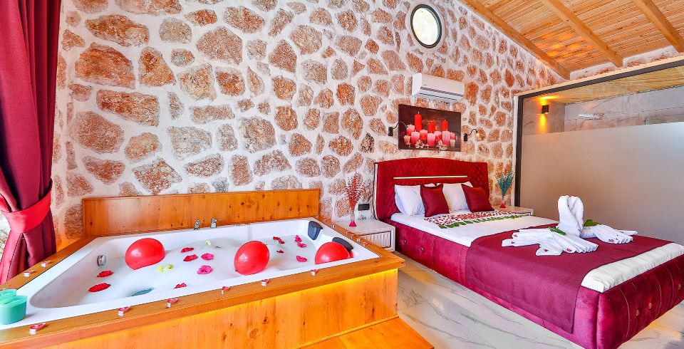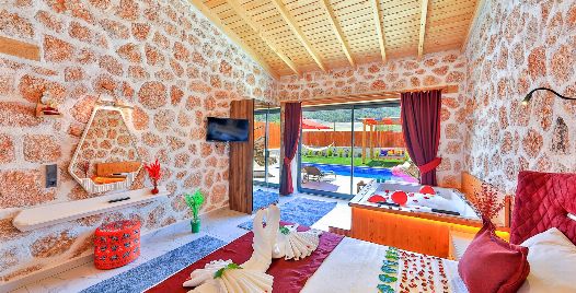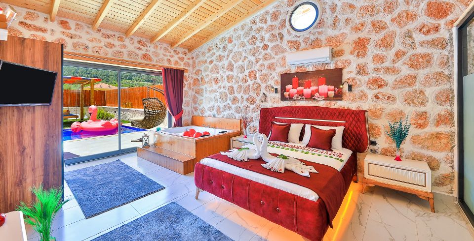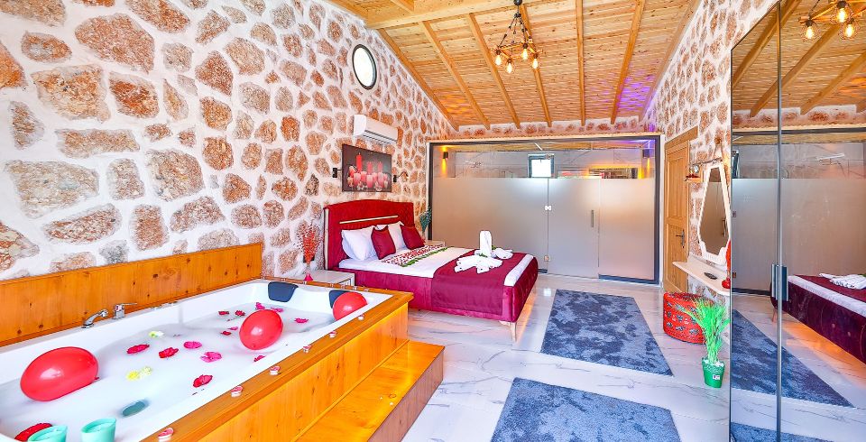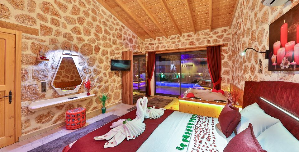 1. Yatak Odası: Çift kişilik yatak, klima, jakuzi, TV, komodin, elbise dolabı, makyaj masası, banyo ve tuvalet bulunmaktadır.