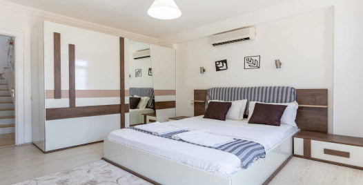 4. Yatak Odası : 1 adet çift kişilik yatak, klima, elbise dolabı, makyaj masası, komodin, ortak kullanım banyo ve lavabo bulunmaktadır.