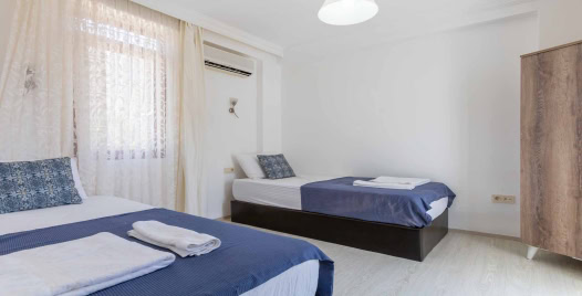 3. Yatak Odası : 2 adet tek kişilik yatak, klima, komodin, elbise dolabı, makyaj masası, ortak kullanım banyo ve lavabo bulunmaktadır.