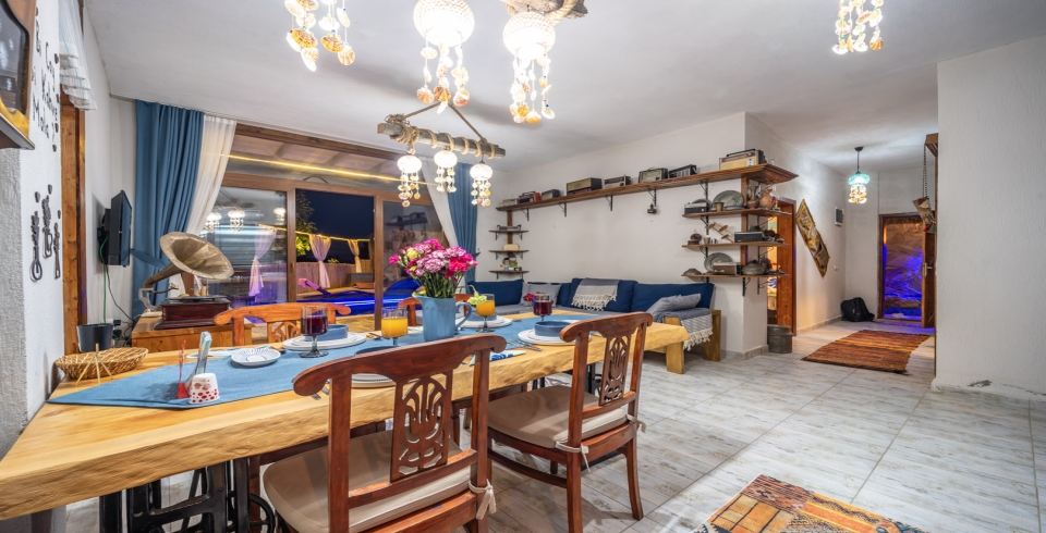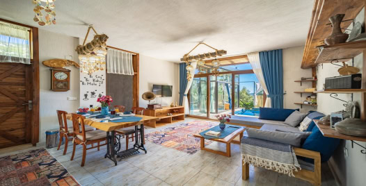 Salon: Modern oturma grubu, televizyon, klima, orta sehpa, yemek masası, sandalyeler ve havuz terasına çıkış bulunmaktadır.