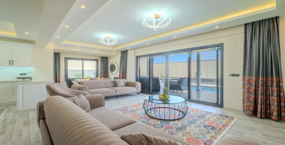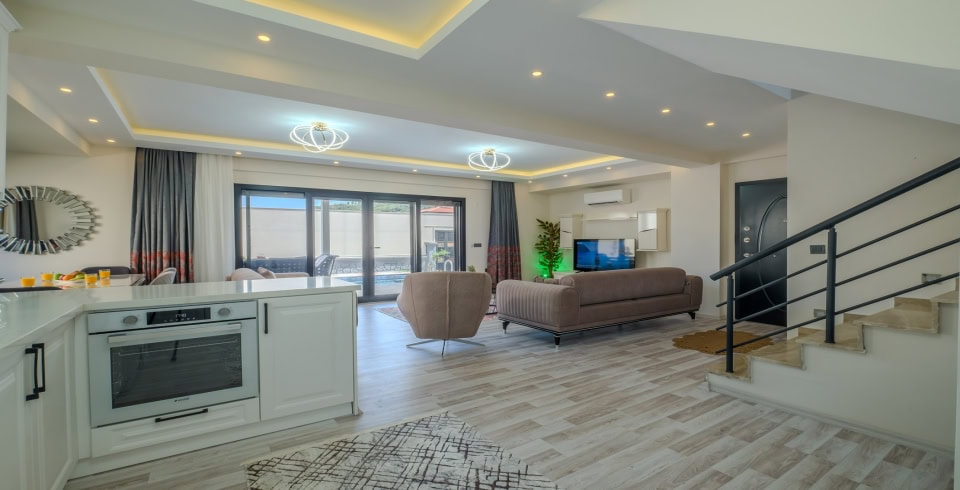 Salon: Villamızın geniş ve ferah salon katı içerisinde oturma grubu, LCD TV, yemek masası, kablosuz modem, uydu, sehpa, klima, banyo ve tuvalet bulunmaktadır.