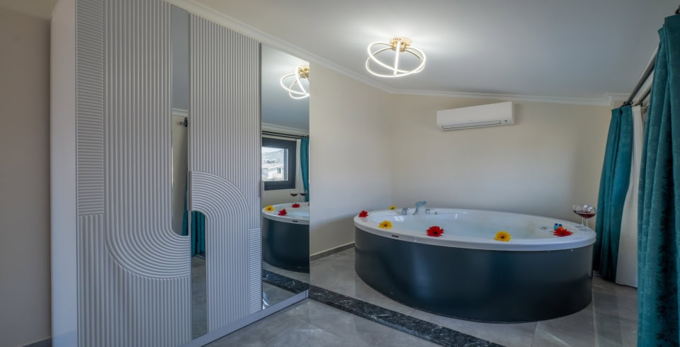 1.Yatak odası: 1 çift kişilik yatak + elbise dolabı + komodin + klima + ebeveyn banyo + jakuzi