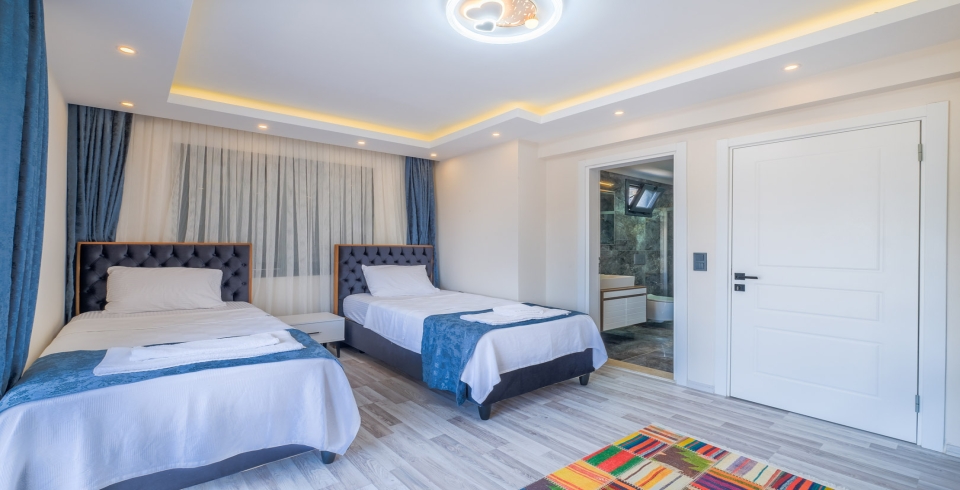 2.Yatak odası: 2 tek kişilik yatak + elbise dolabı + komodin + klima + ebeveyn banyo