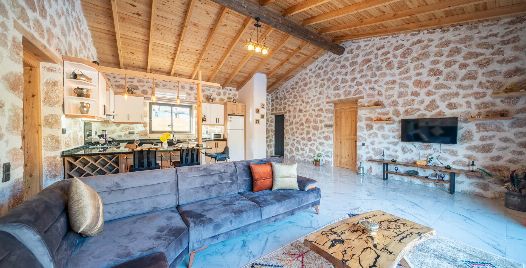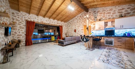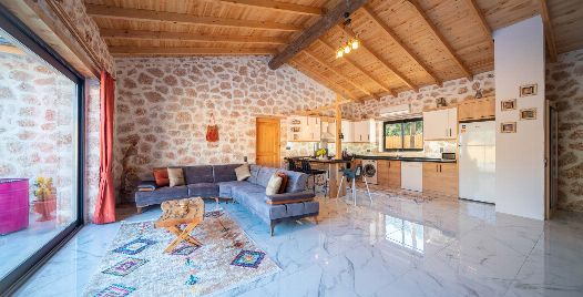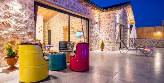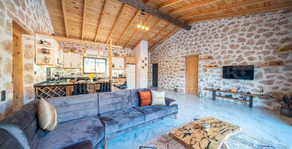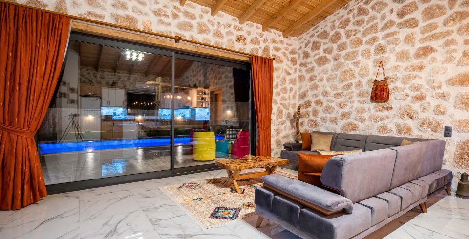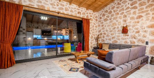 Salon: Villa salonunda konforlu oturma grubu, klima, TV, internet, uydu alıcı, yemek masası, sehpa bulunmaktadır.