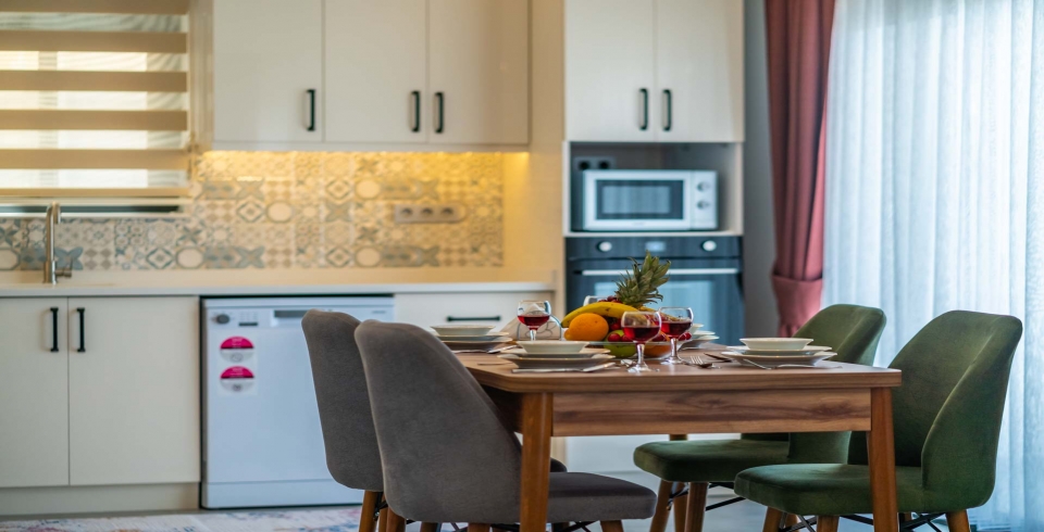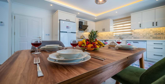 Mutfak : Villamızın mutfağında buzdolabı bulaşık makinası, çamaşır makınası,4 lü ocak, ketıl, 4 kişilik yemek takımı bulunmaktadır.
