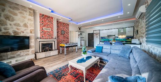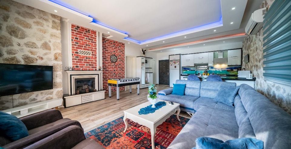Salon: Villa salonunda konforlu oturma grubu, klima, TV, internet, uydu alıcı, yemek masası, sehpa bulunmaktadır.