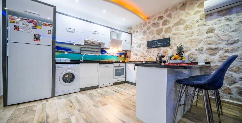 Mutfak: Villamızın mutfağında buzdolabı bulaşık makinası, çamaşır makinası, 4'lü ocak, ketıl, mikro dalga fırın, filtre kahve makinası yemek takımı bulunmaktadır.