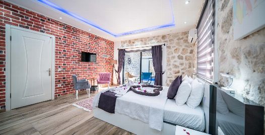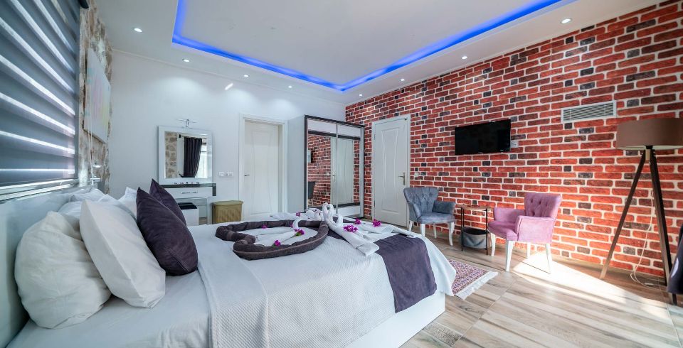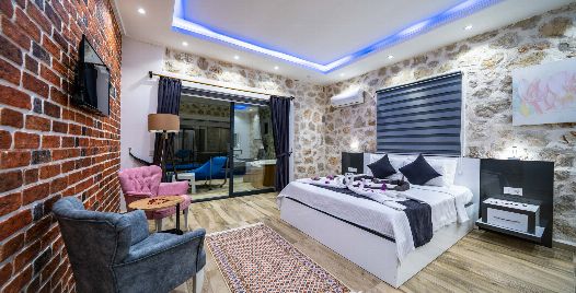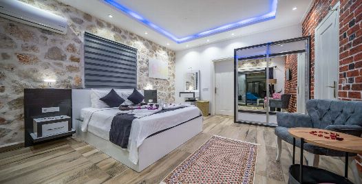 1. Yatak Odası: Çift kişilik yatak, klima, jakuzi, komodin, elbise dolabı, makyaj masası, banyo ve tuvalet bulunmaktadır.