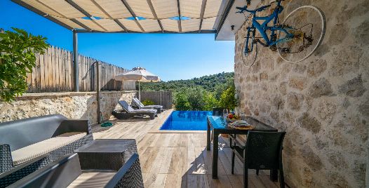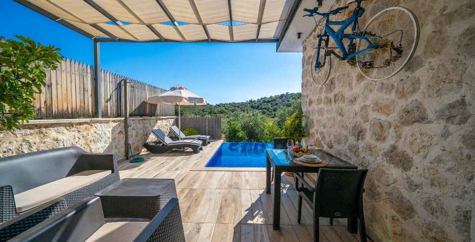 Dış alanda ise tamamen korunaklı özel yüzme havuzu, şezlonglar, güneş şemsiyesi, barbekü ve oturma alanı yer alır. Bu alan, günün her saati sevdiklerinizle birlikte doğanın sesleri eşliğinde dinlenebileceğiniz huzurlu bir köşedir.