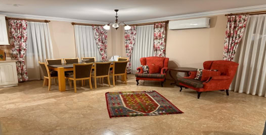 Salon: Özenle döşenmiş salon, modern koltuklar, klima, Lcd tv, şömine, 8 kişilik yemek masası, uydu alıcısı ve salondan balkona çıkış kapısı bulunmaktadır.
