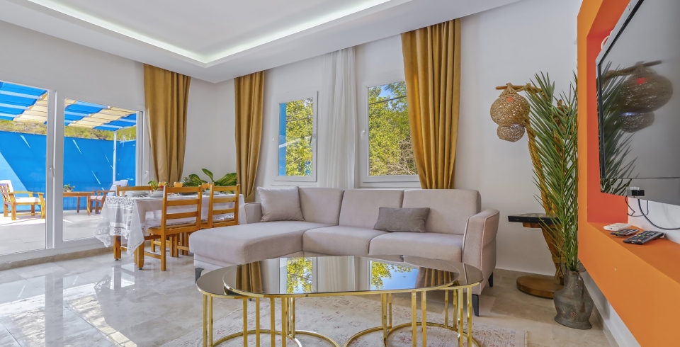Salon : Villa Ekinezya’nın salonunda sizi şık bir oturma grubu ile klima, TV, internet, uydu, koltuk, sehpa ile ferah bir salon bekliyor olacaktır. Havuz terasına çıkış yapılmaktadır.