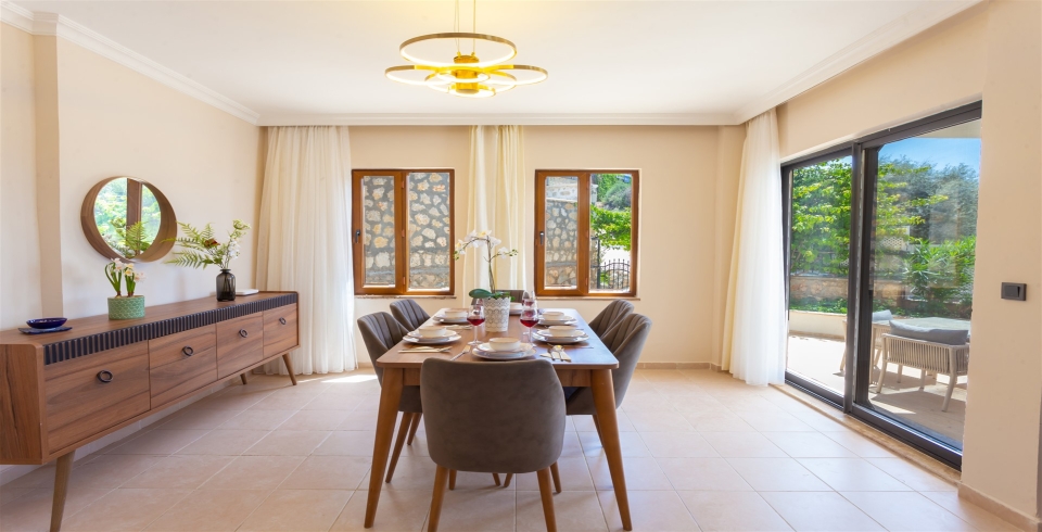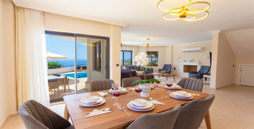 Salon: Klimalı salonu içerisinde oturma grubu, yemek masası, TV, internet yer almaktadır. Salondan havuz terasına çıkış bulunmaktadır.