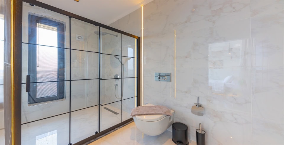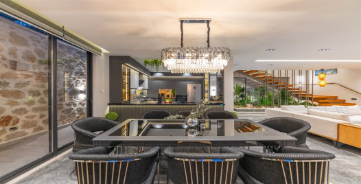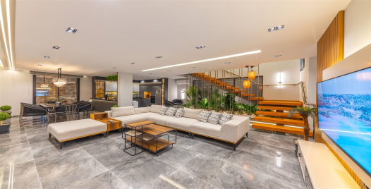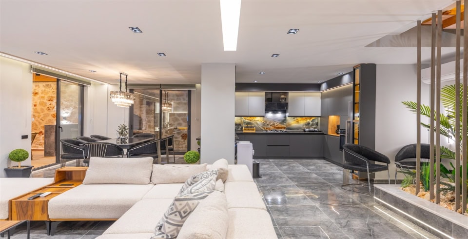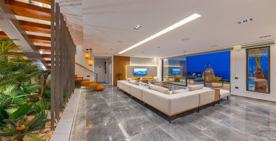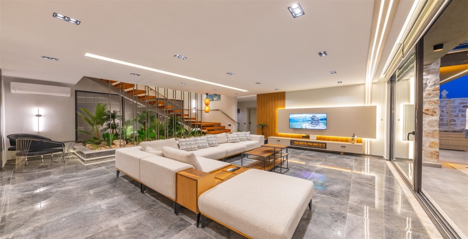 Salon : Manzaralı salon içerisinde konforlu oturma grubu, TV, klima bulunmaktadır. Salondan havuz terasına geçiş vardır.